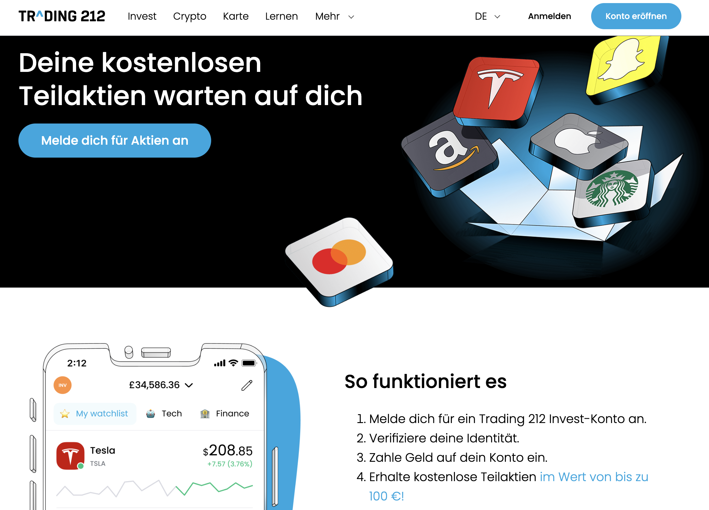 Die spezifische Aktie wird von Trading 212 zufällig zugewiesen (du kannst kein bestimmtes Unternehmen auswählen). Die Gutschrift erfolgt innerhalb von drei Werktagen nach erfüllter Mindesteinzahlung.