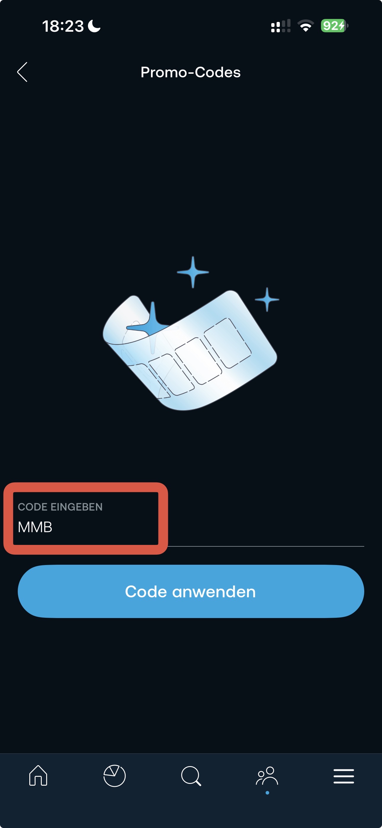 Öffne die Trading 212 App und navigiere zum Menüpunkt "Aktionscode" oder "Promo Code". Dieser Bereich ist meist unter den Kontoeinstellungen oder im Hauptmenü zu finden. Gib dort den Code MMB ein und bestätige die Eingabe.