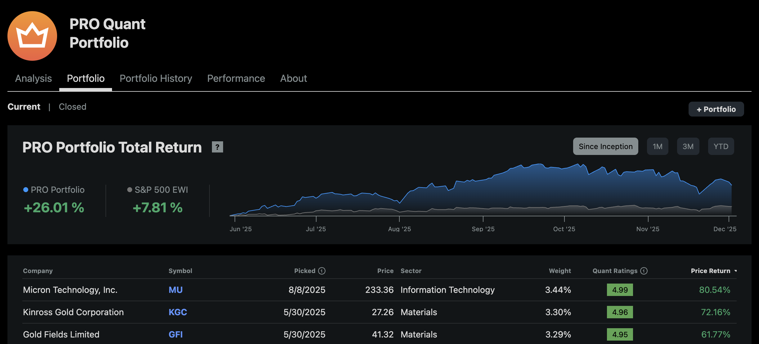 Early performance has been remarkable. From June through late 2025, the PRO Quant Portfolio delivered approximately 40% returns compared to roughly 7% for the equal-weighted S&P 500. That's significant outperformance, though the track record is still young.