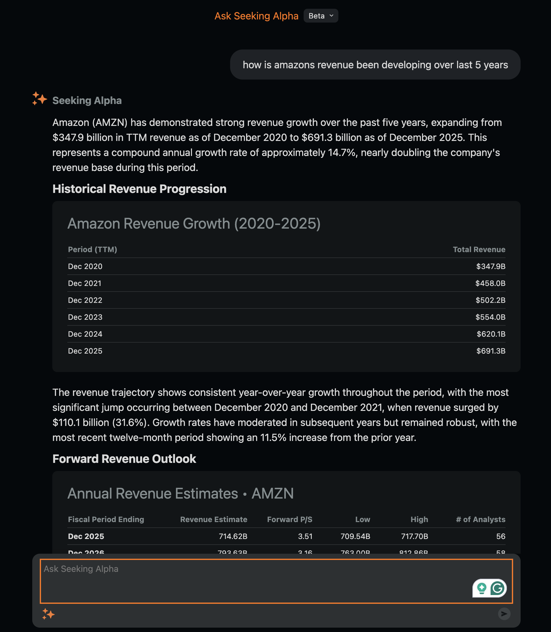 Pro subscribers get exclusive access to "Ask Seeking Alpha," an AI-powered research assistant designed specifically for investment analysis. Unlike generic AI chatbots, this tool integrates directly with Seeking Alpha's data, ratings, and article archive.
